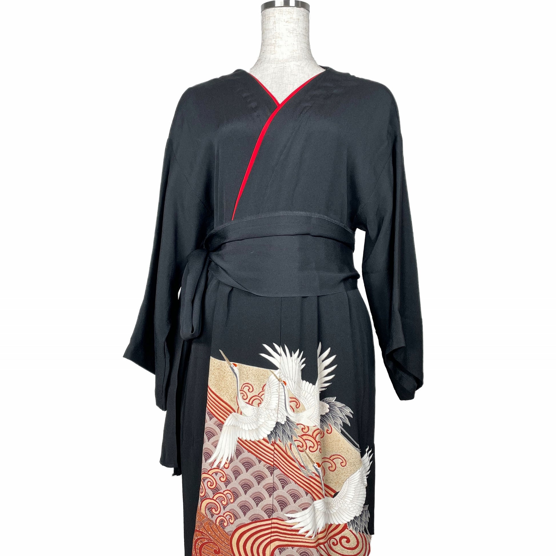 One finished dress requires one Kimono. Most of original Kimonos, before remade, are manufactured in Showa period after the war, in 1970s - 1980s, more or less vintage. Remake work was done very recently. Material is pure Silk made in Japan. The crane pattern is a symbol of longevity.