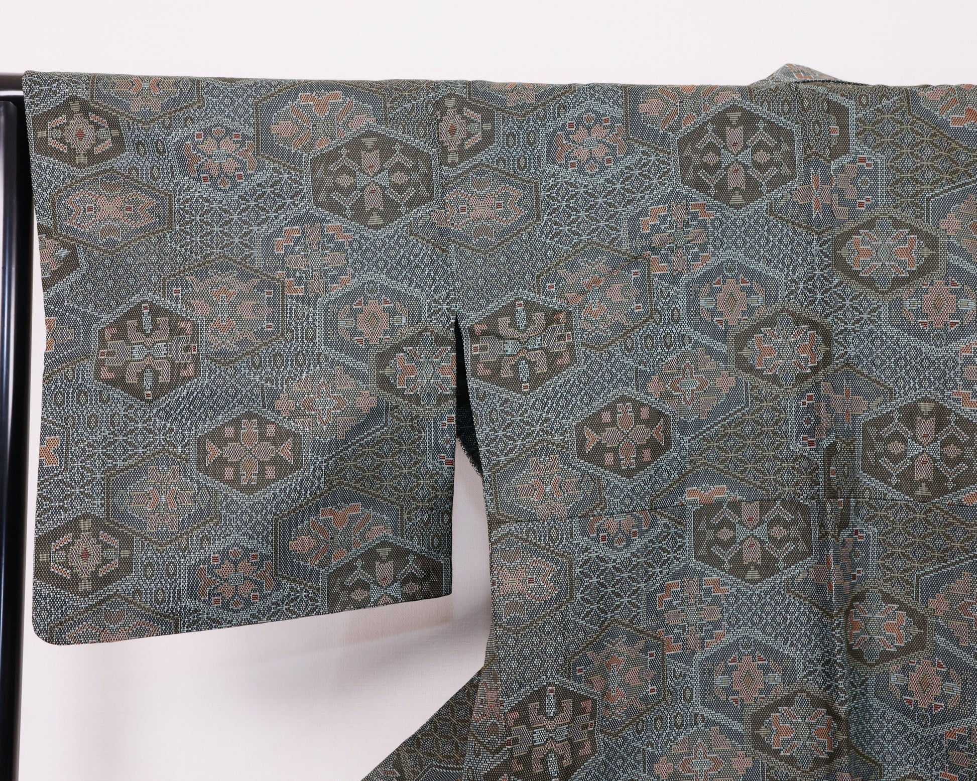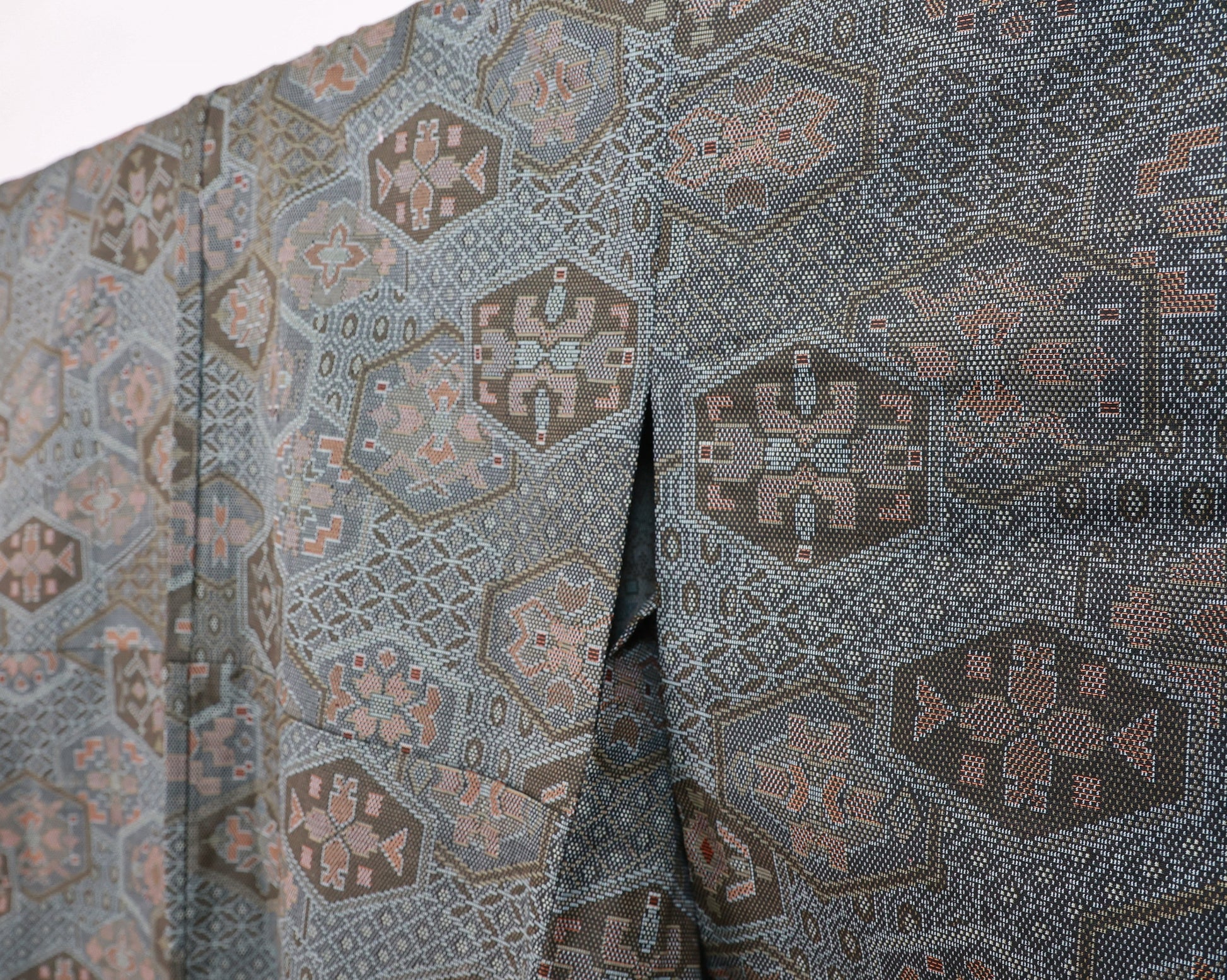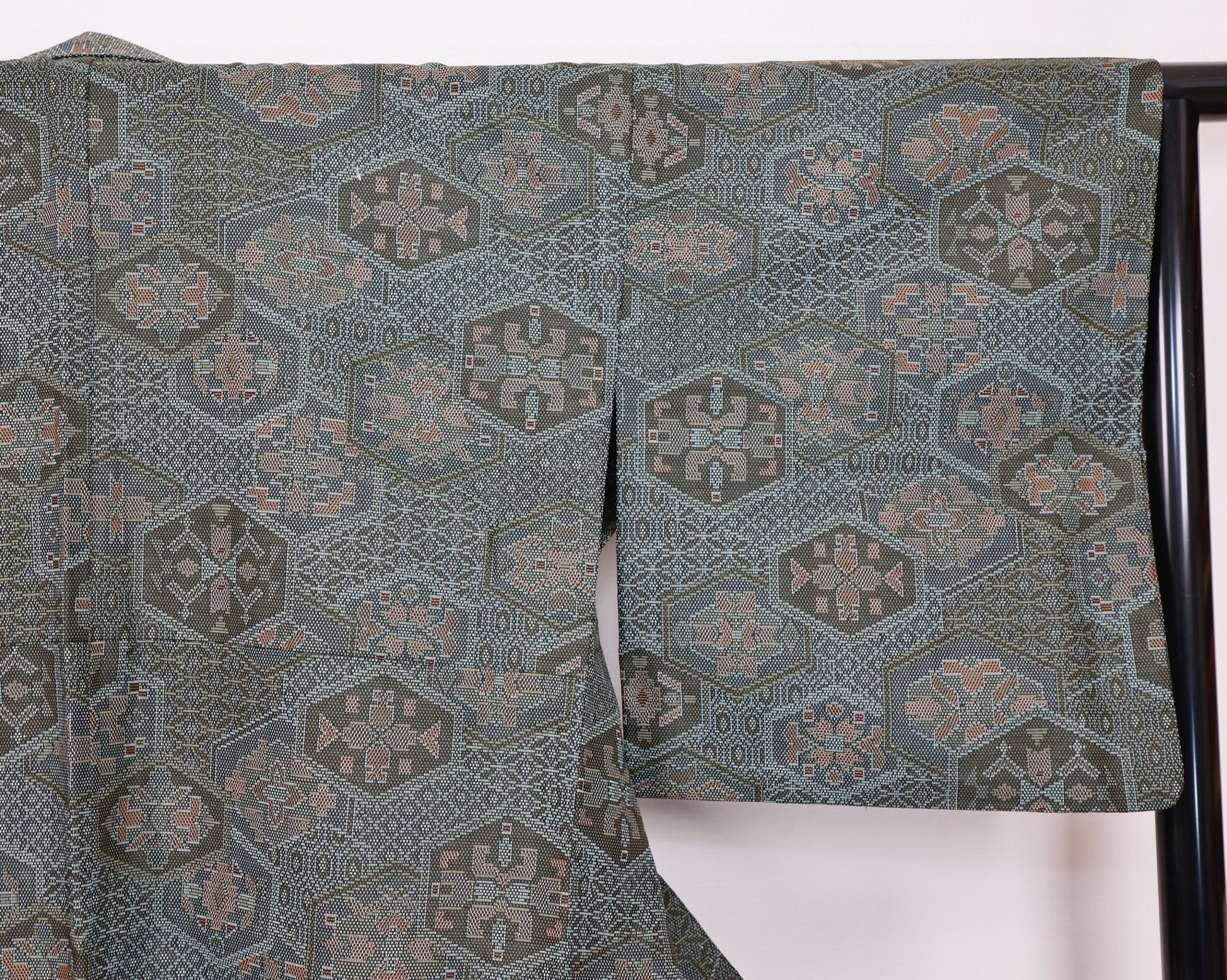 This kimono is a Nishijin-ori made to resemble the color and pattern of Oshima Tsumugi.