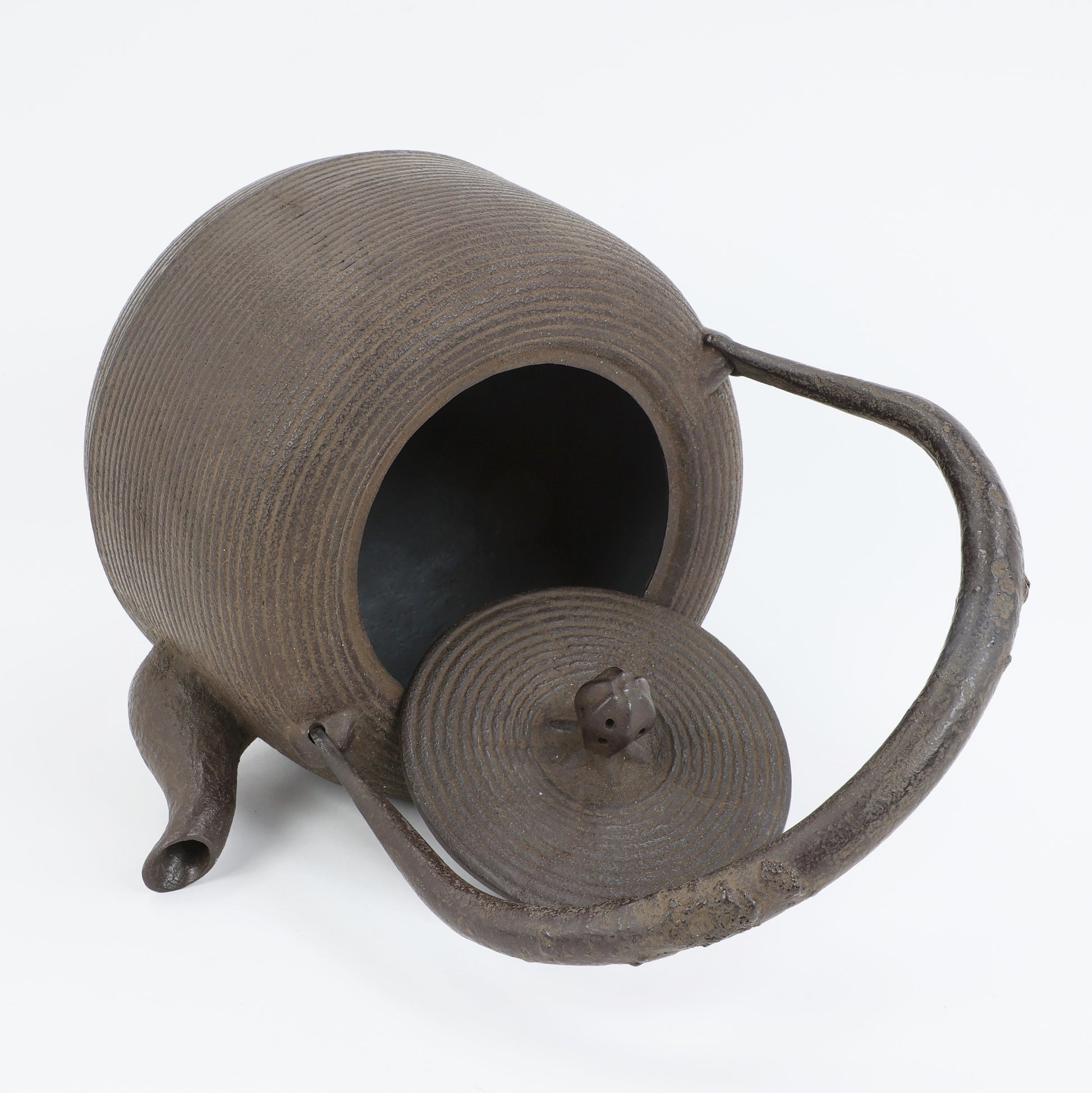 The main difference between iron kettle (Tetsubin) and iron teapot (Tetsu Kyusu) is that the former is for boiling water and can be used over an open flame. The latter is for brewing tea and should not be used over an open flame. This exhibition product is the former.