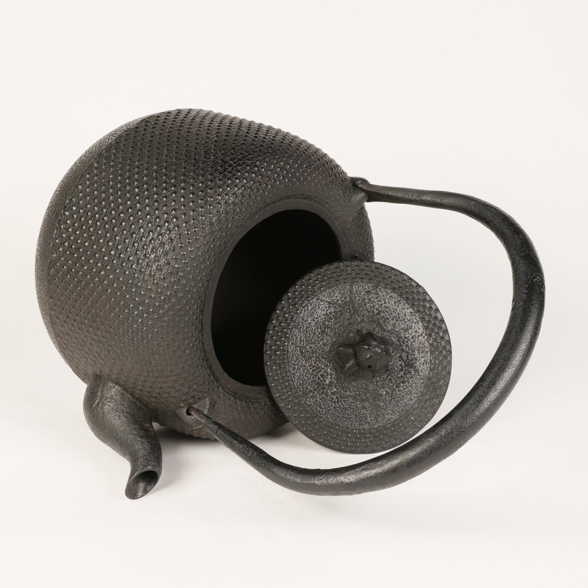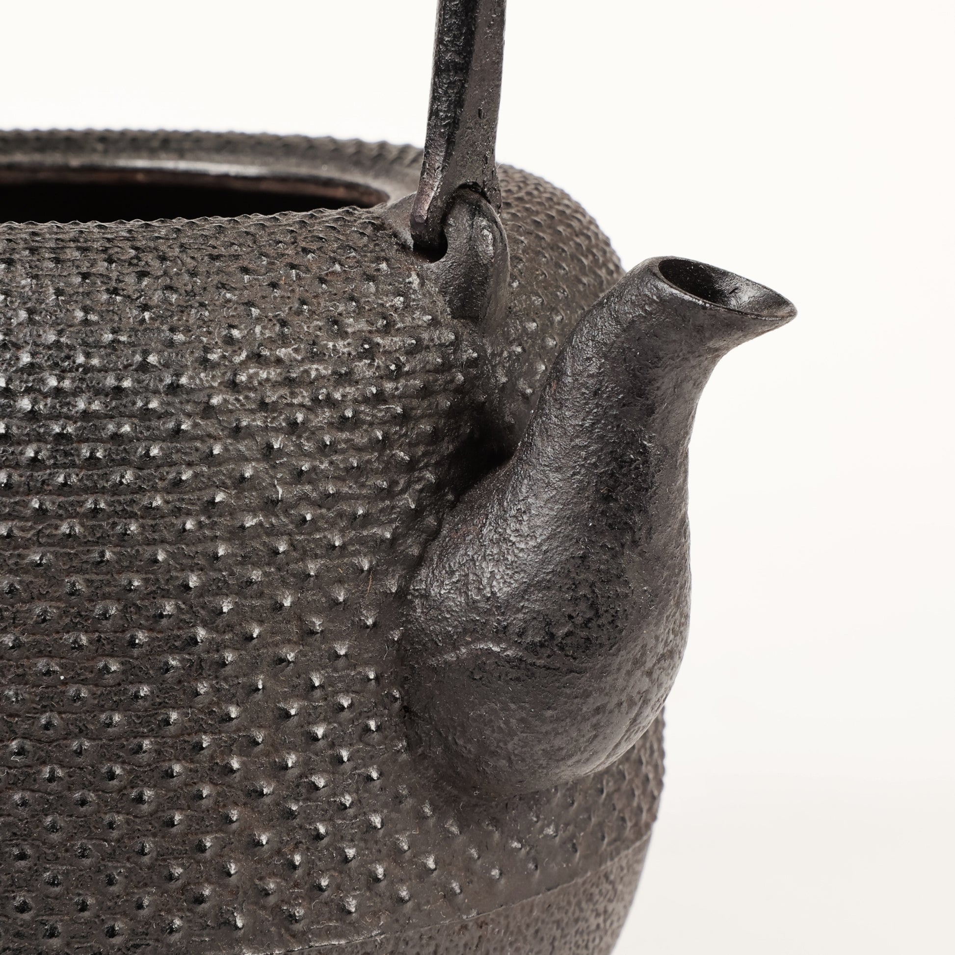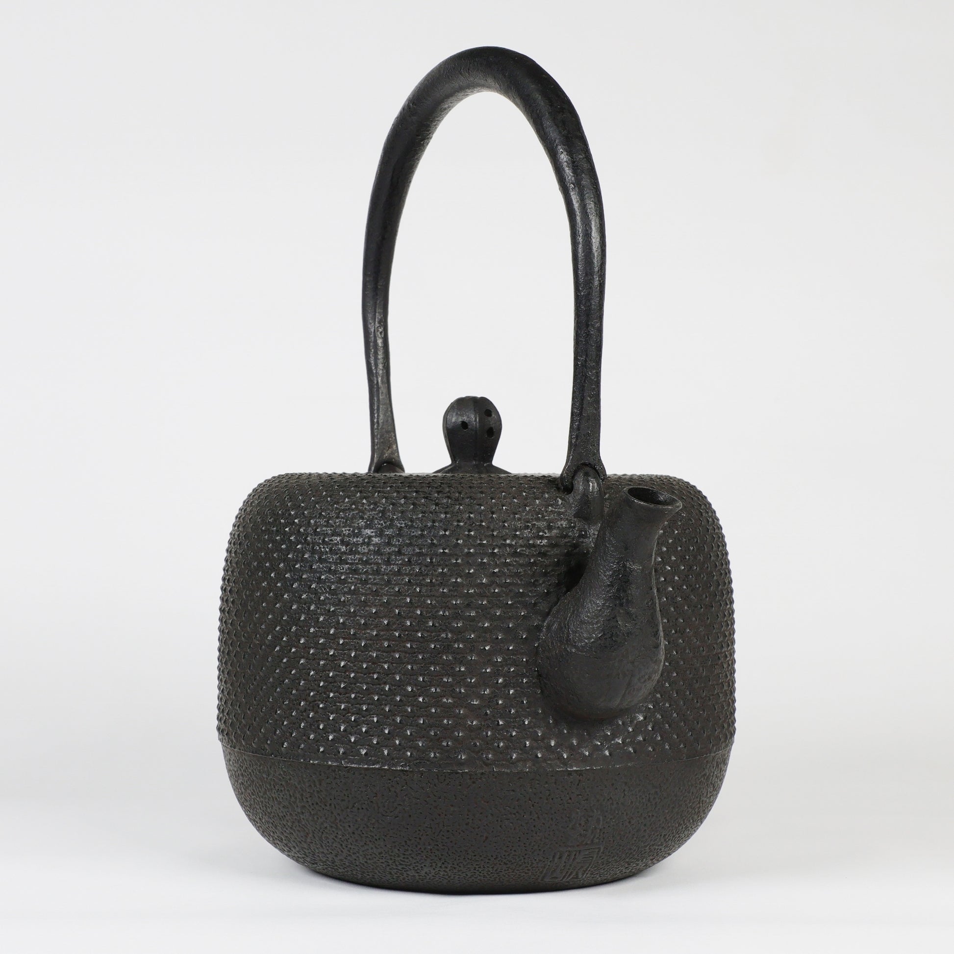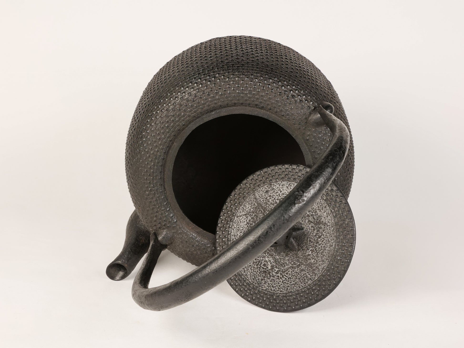 The main difference between iron kettle (Tetsubin) and iron teapot (Tetsu Kyusu) is that the former is for boiling water and can be used over an open flame. The latter is for brewing tea and should not be used over an open flame. This exhibition product is the former.